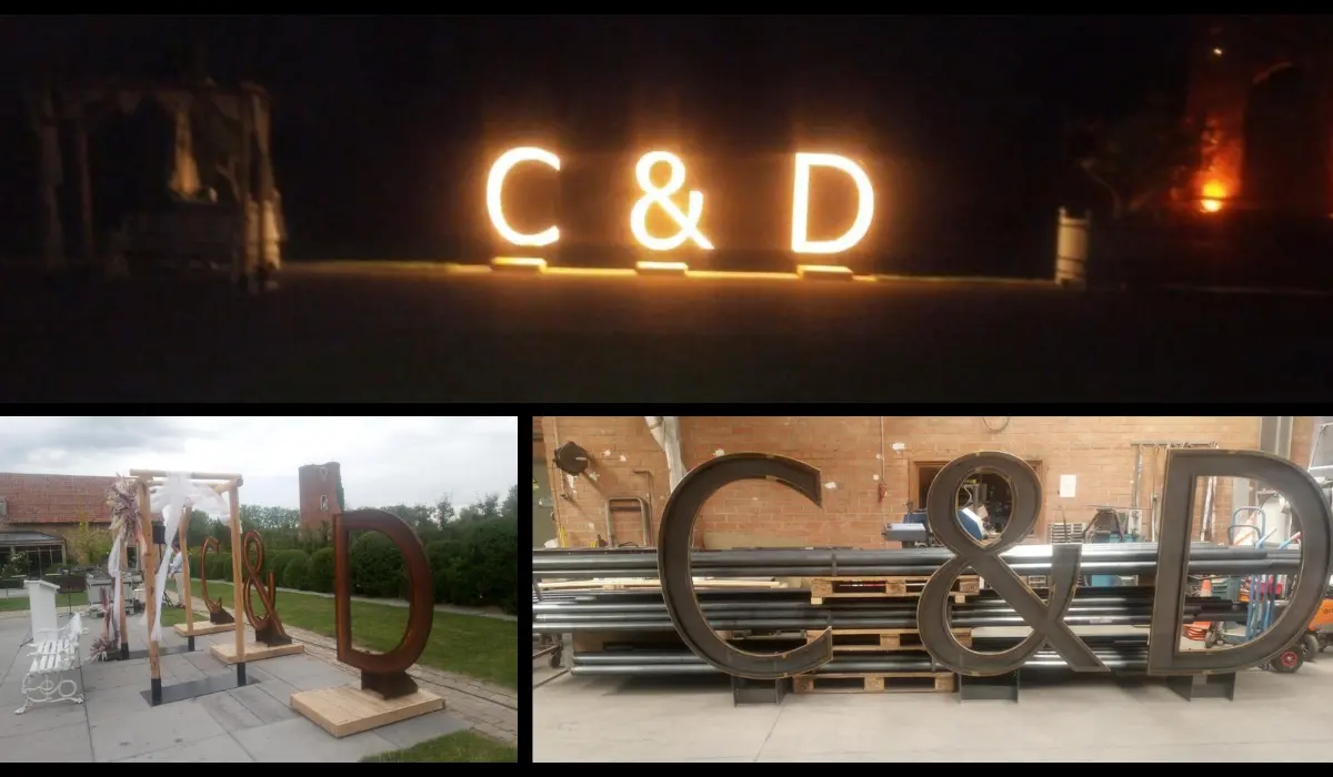LASTECHNIEK Twee metalen letters, gelast met de Laser Lux 2000 en verlicht als eyecatcher voor het huwelijk van Chloë & Daniel.